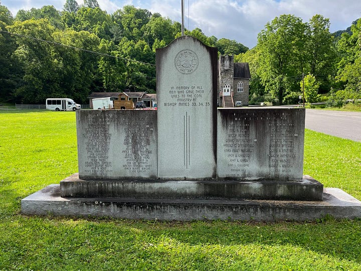 In Bishop I met Pastor Daniel Bradley. Dan pastors Alexander Memorial United Methodist Church—a church built for coal miners, by coal miners. The first thing that struck me as we pulled up was the monument that marks the turn onto Church House Hollow Road. Marked with the seal of the United Mine Workers of America, the monument (now streaked by algae and acid rain) commemorates “The men who gave their lives to the coal industry at Bishop Mines 33, 34, 35.” Do you hear it? Not the men who gave their lives for freedom or the defense of hearth and home … but to the coal industry. A sentiment that runs as deeply in the veins of this community as coal runs in the seams of their mountains.