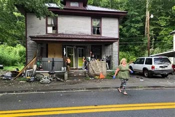 So we piled into Dan’s truck, and went to visit “Lower Camp.” Within one hundred yards of the church building we find a row of what had once been lovely old two-story farm style houses with big front porches, and generous windows. Many of them had been designed as two-family dwellings. The first house was still relatively whole, but the side yard was filled with abandoned equipment and building supplies, covered with weeds and piled within a few feet of the family’s swing set. The next house? Just a cement slap covered with debris. House after house had missing rooves, blue tarps pulled over broken windows, front porches mostly collapsed. Overgrown and broken down, many with evidence of past fires. But this was not an abandoned neighborhood—there were still families living in these houses. Dazed men sat on collapsing front porches. According to my hosts, these men were likely lost in meth.